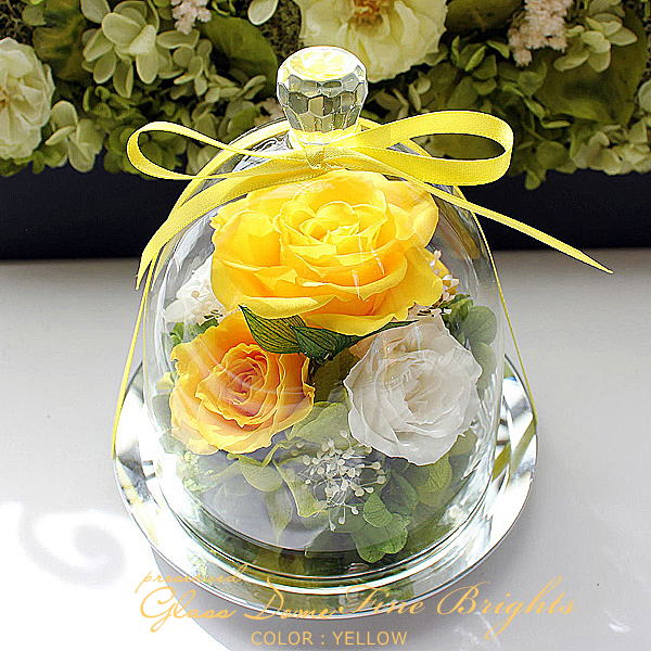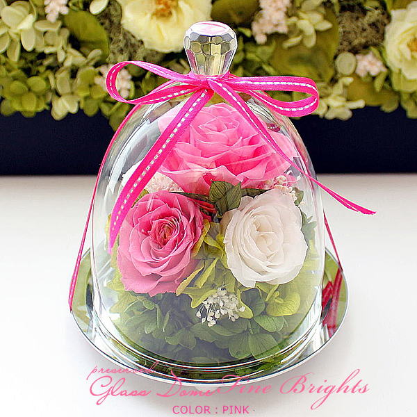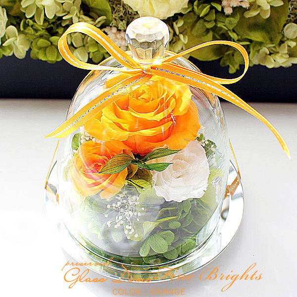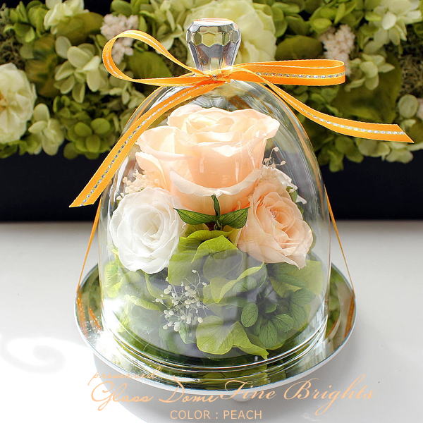 プリザーブドフラワーとグリーンの美しさに今人気!のお洒落なガラスドームの花器のコラボです。これってベストマッチの組み合わせですネ!底面のミラー(鏡)にプリザーブド達が反射されて・・・ん~とにかく見事です!特に自然光が反射した時は素晴らしいですヨ!写真画像で十分伝わっていないか心配です。ガラスで覆われているのでホコリの心配も少ないからオフィスやお店にもOKです!またご自宅のニッチなんかに置いて夜は上部からライトアップしても光が反射してとても美しいのでオススメです。